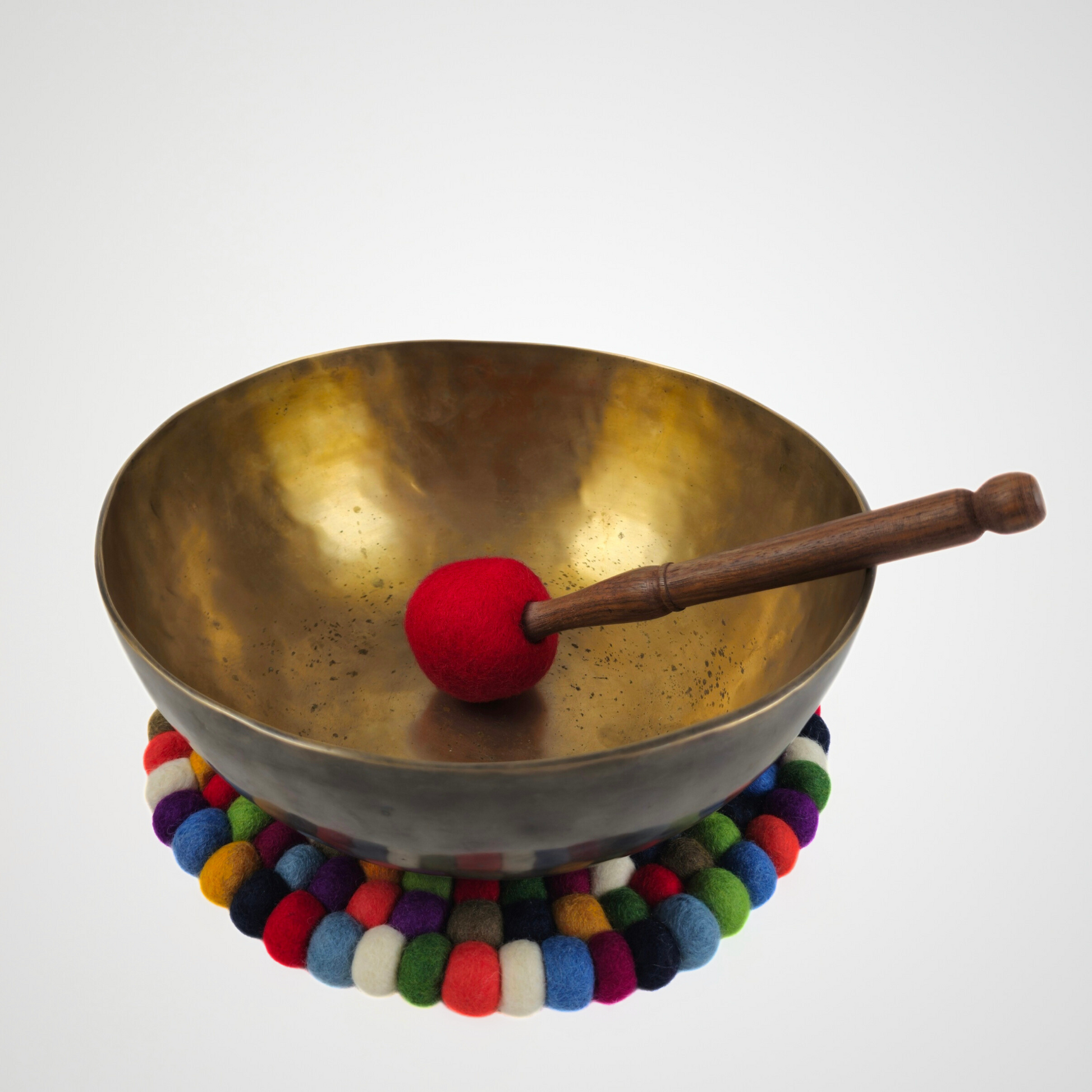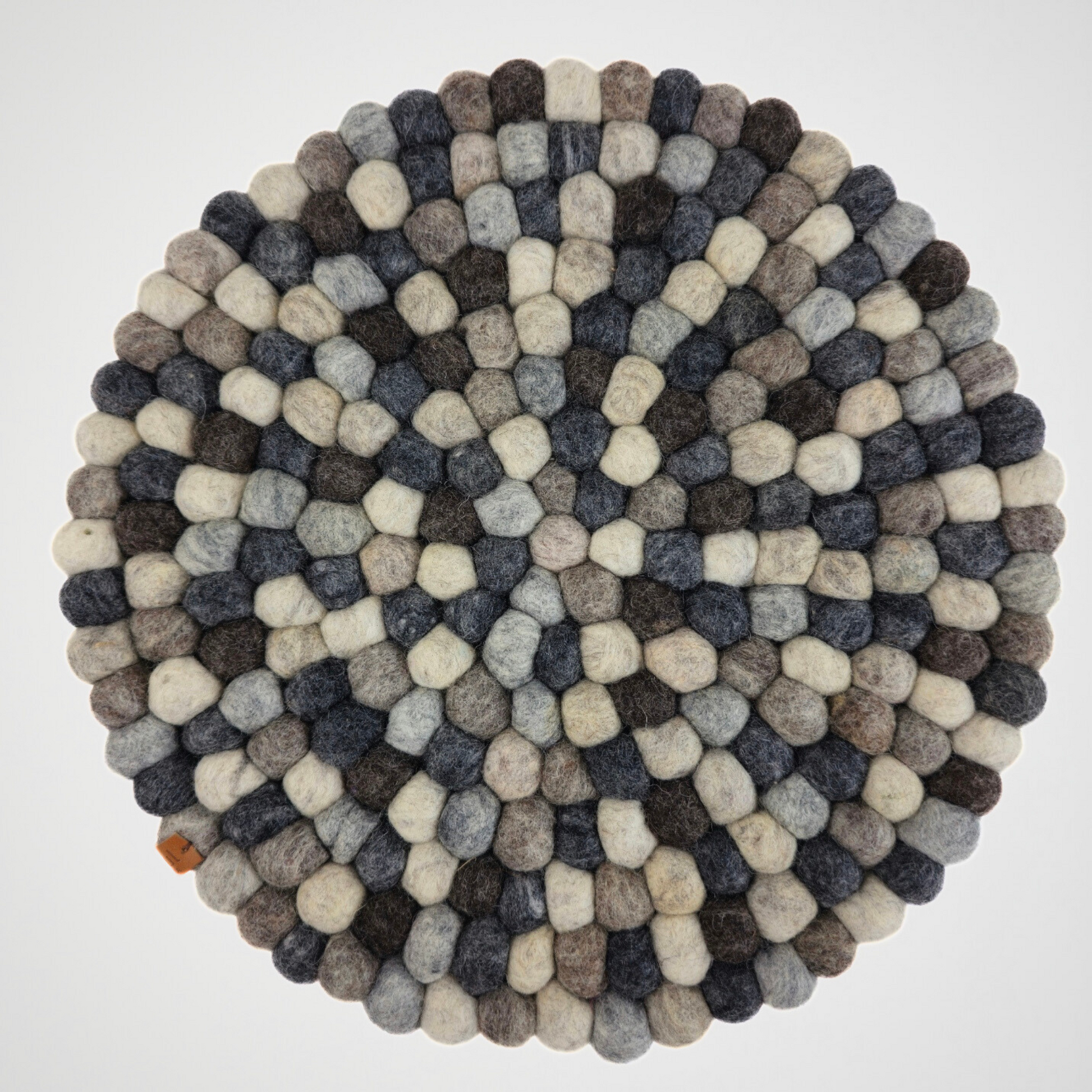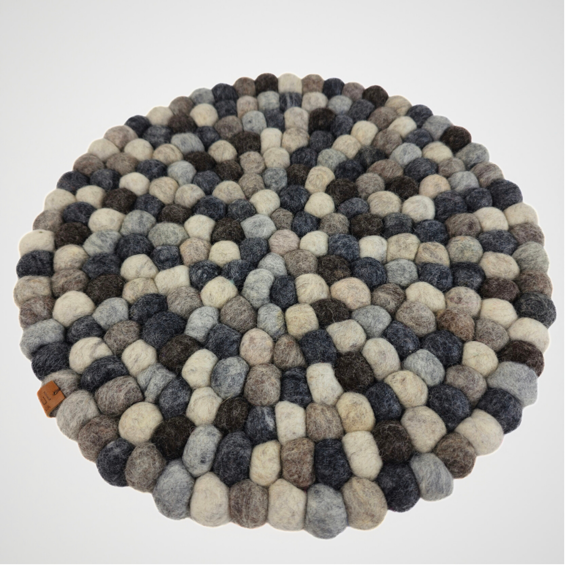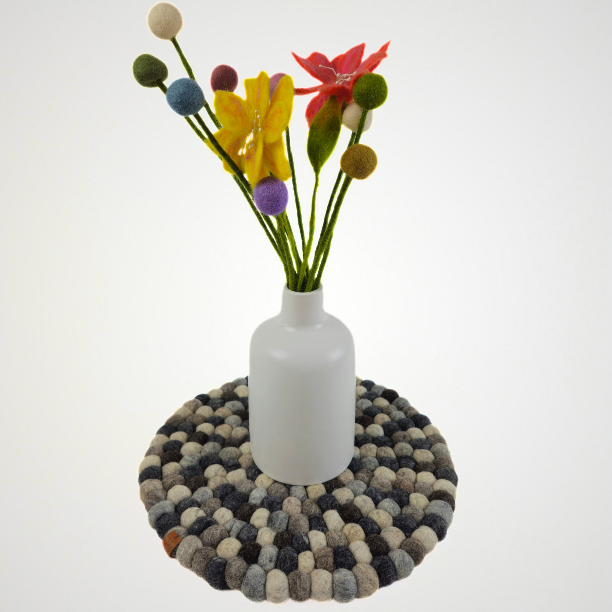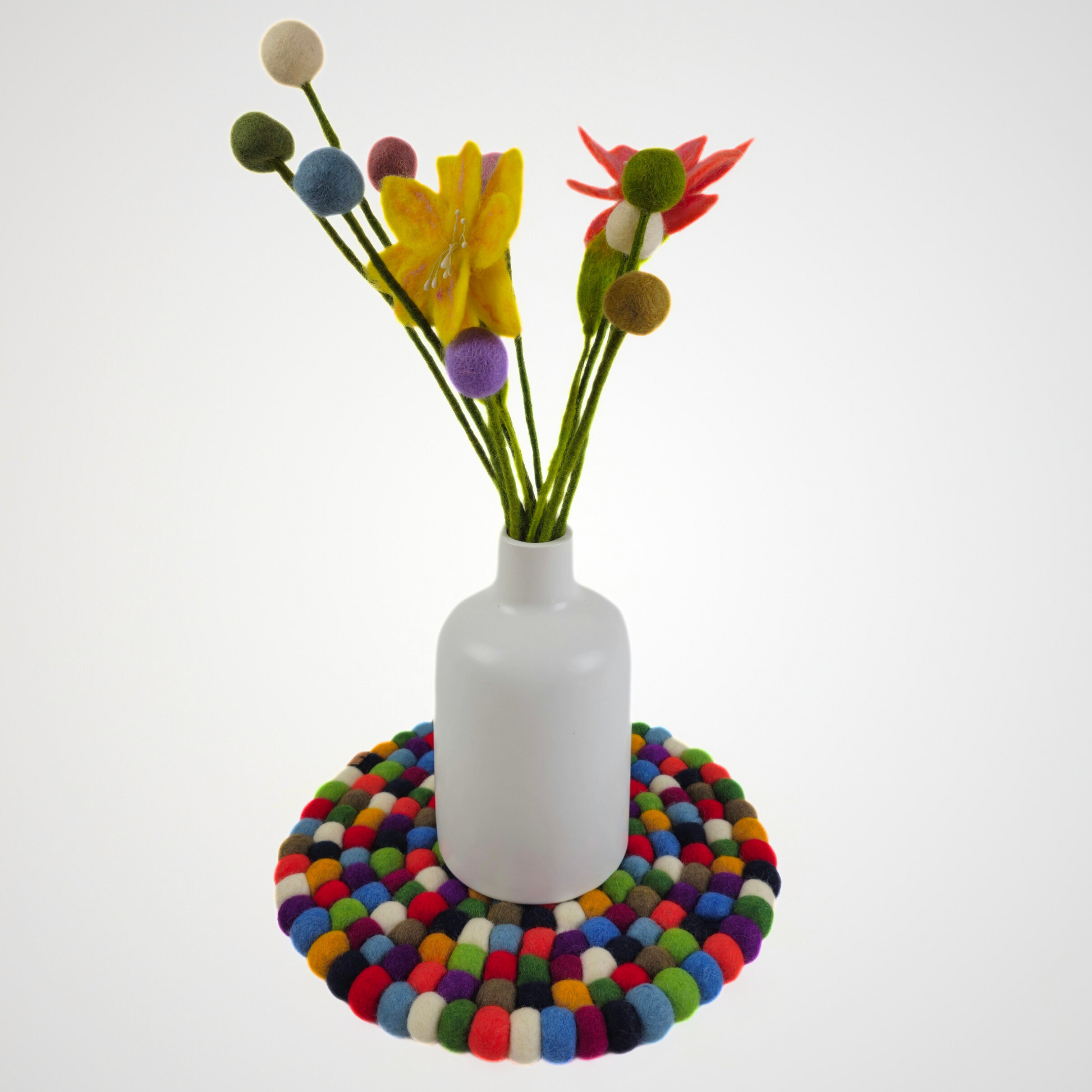 Handcrafted from soft felted wool, this 12-inch round pom pom mat brings charm and functionality to any space. Each colorful felt ball is carefully stitched together to create a sturdy, versatile piece that can be used as a placemat, chair mat, or decorative accent. Durable yet playful, it protects surfaces while adding a cozy, artisanal touch to your home décor.