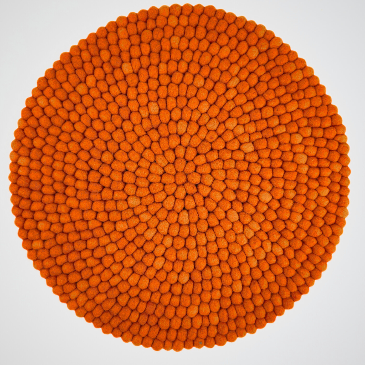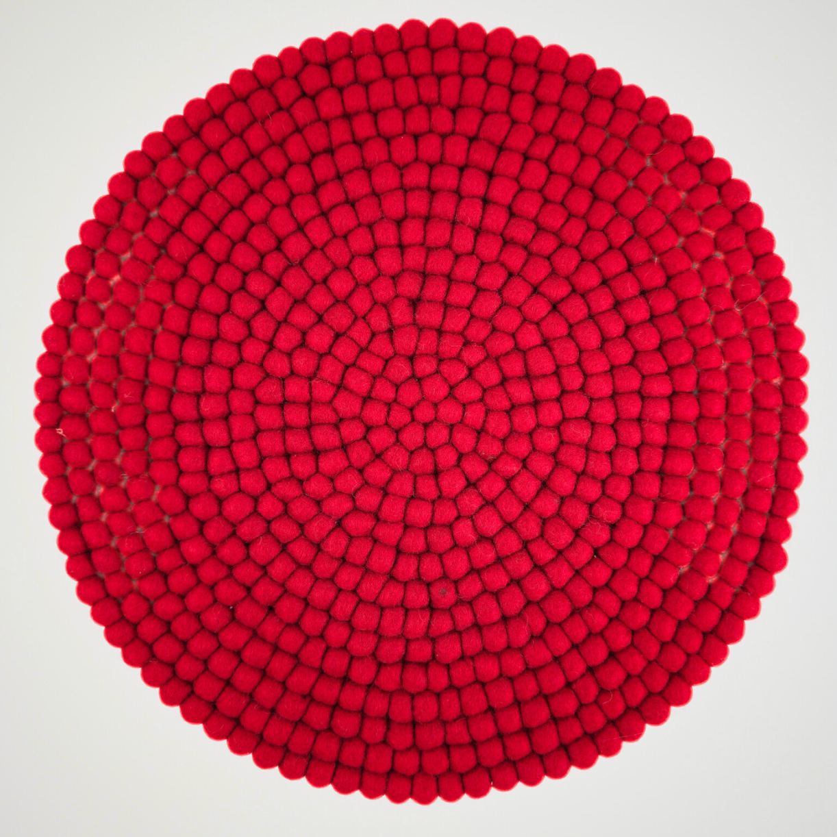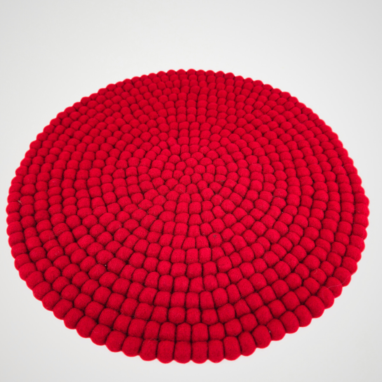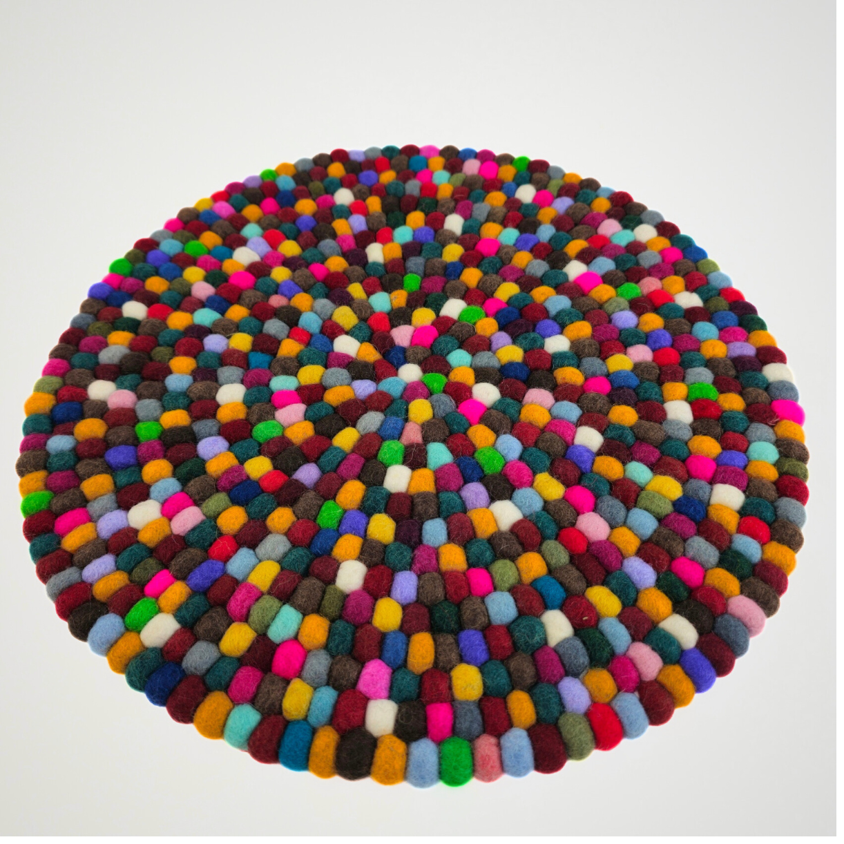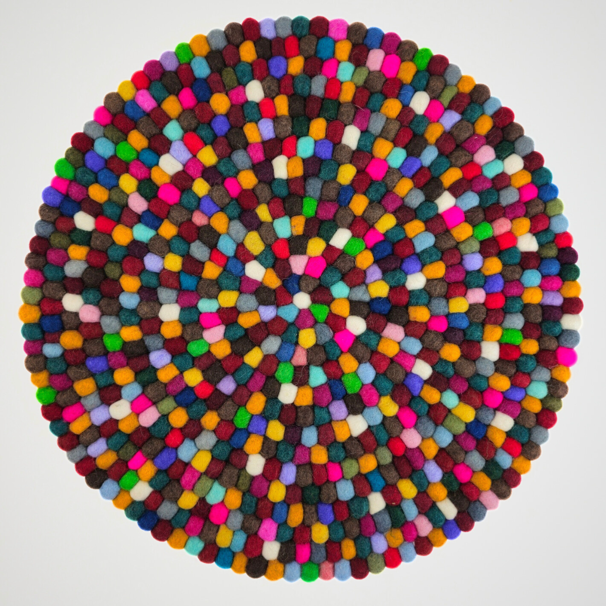 Handcrafted from soft felted wool, this 15.5-inch round pom pom mat brings charm and functionality to any space. Each colorful felt ball is carefully stitched together to create a sturdy, versatile piece that can be used as a placemat, chair mat, or decorative accent. Durable yet playful, it protects surfaces while adding a cozy, artisanal touch to your home décor.