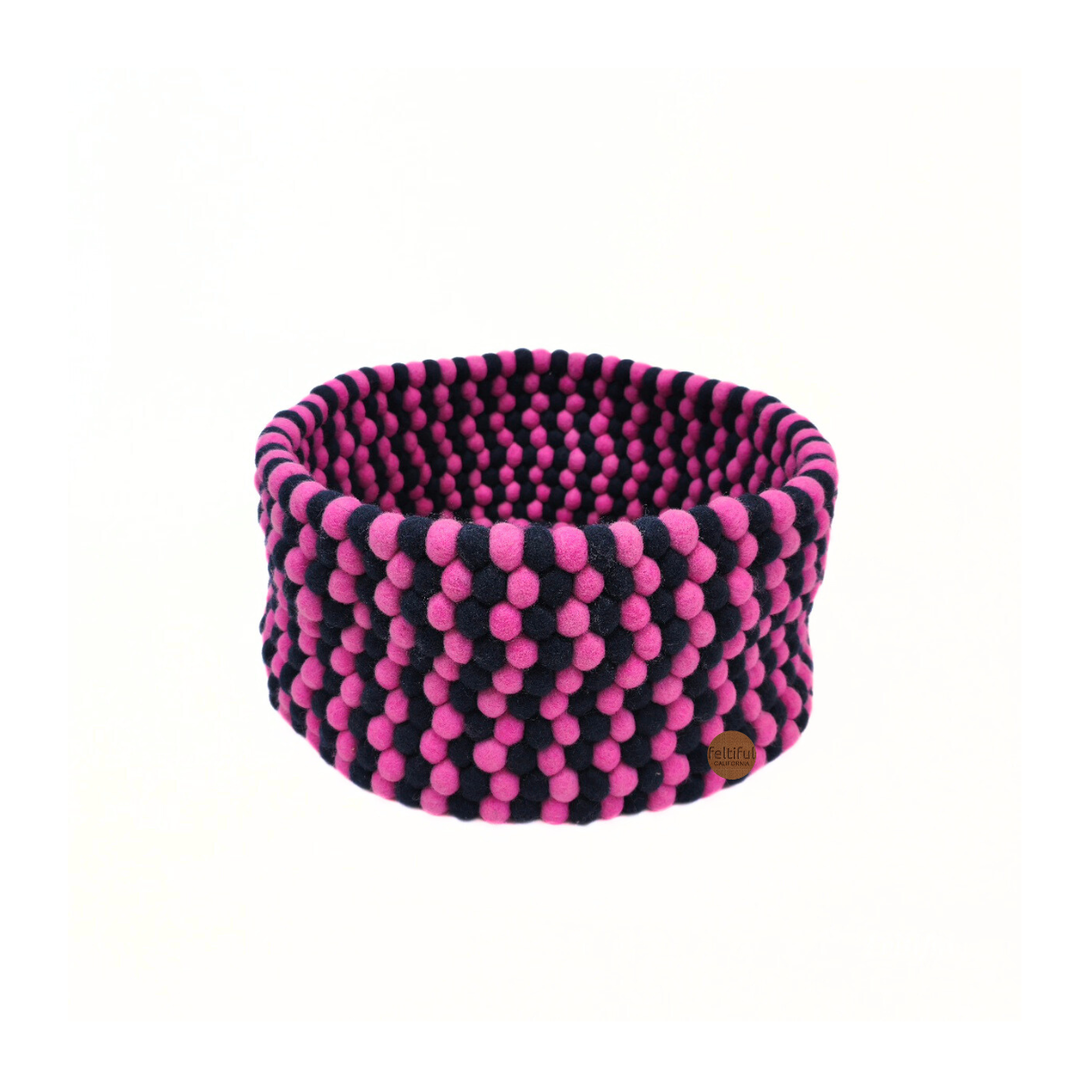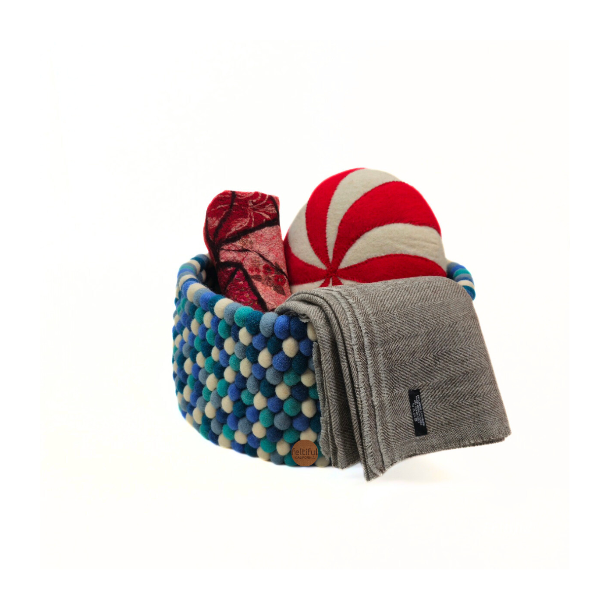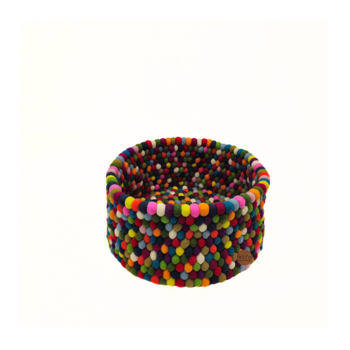 Felt Ball Soft and lightweight but strong and durable, this basket handmade from felt balls can serve many purposes around the home, office or classroom. Highlighted by a most four of colors, the handcrafted felt basket brightens and lightens up any room. Use it to small dog bed or store blanket, toys, any cloths, books, laptops and more.