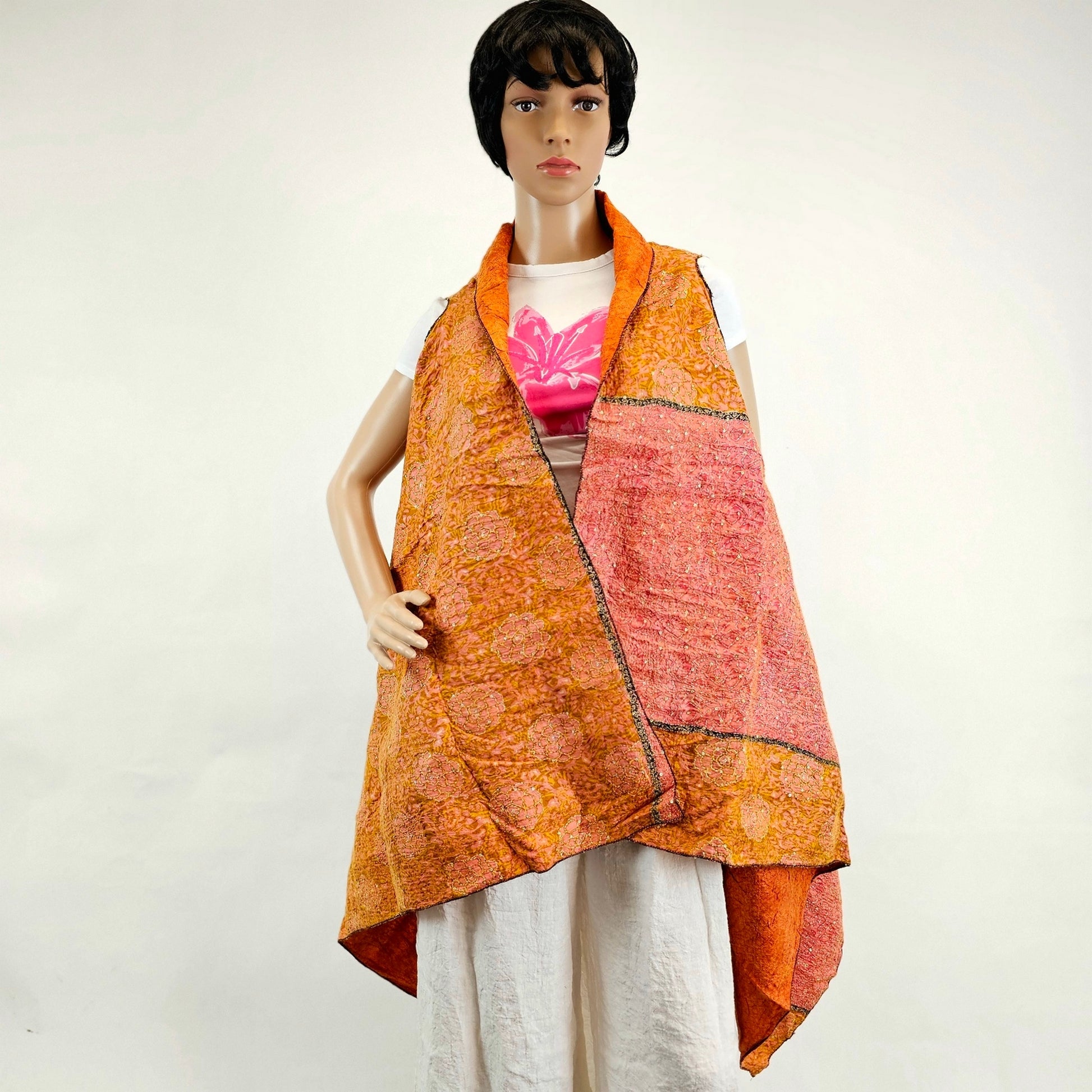 Cozy and playful, this Merino Wool and Saree Reversible Sandwich felted outerwear features a soft texture and charming assorted patch white —perfect for adding warmth and personality to any outfit. One size (free size)