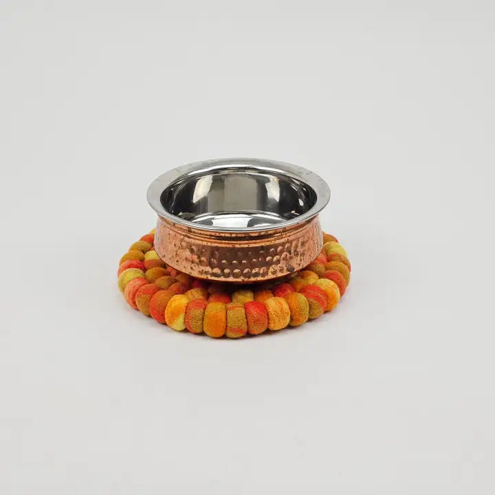 Brighten your table with our Orange Tie Dye Pom Pom Felted Ball Trivet. Handcrafted from soft felt, this vibrant piece blends bold orange tones with playful tie-dye patterns for a lively, artistic touch. Designed to protect your surfaces from heat and scratches, it’s both practical and stylish. Each trivet is unique, showcasing the beauty of artisanal craftsmanship.