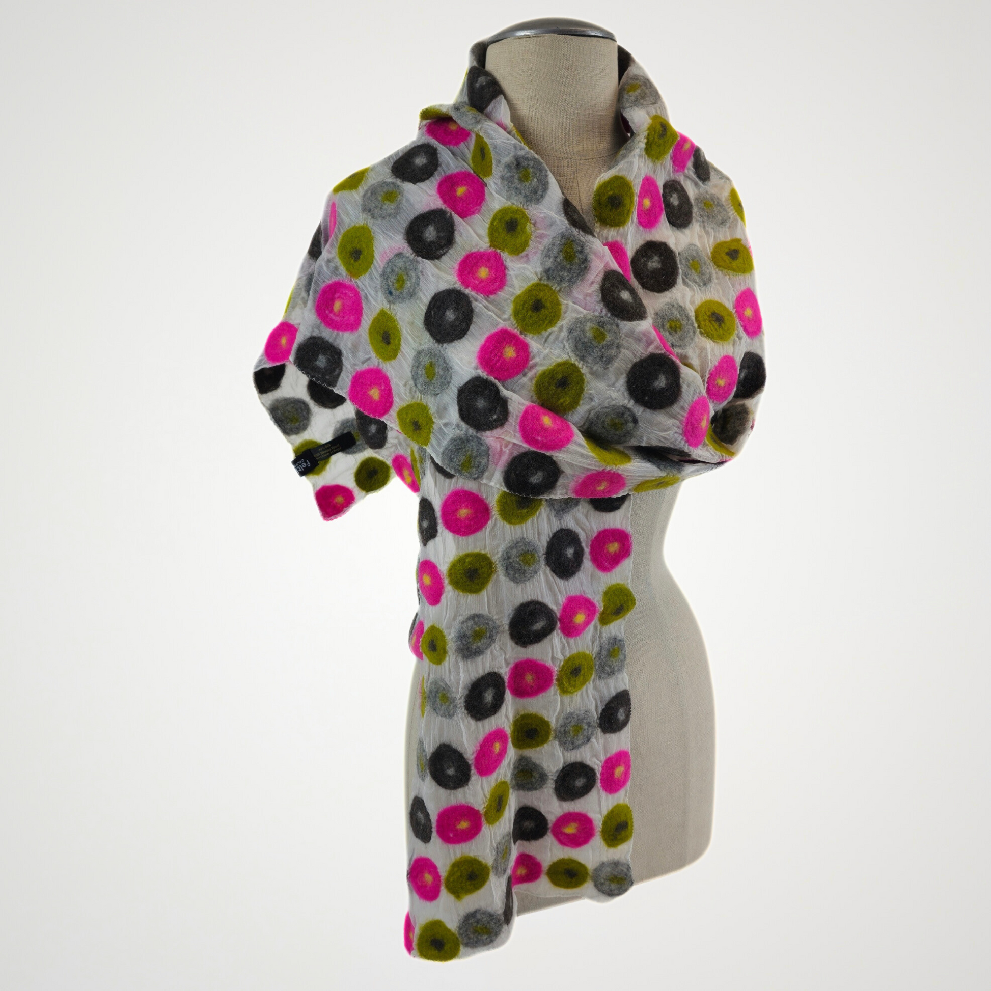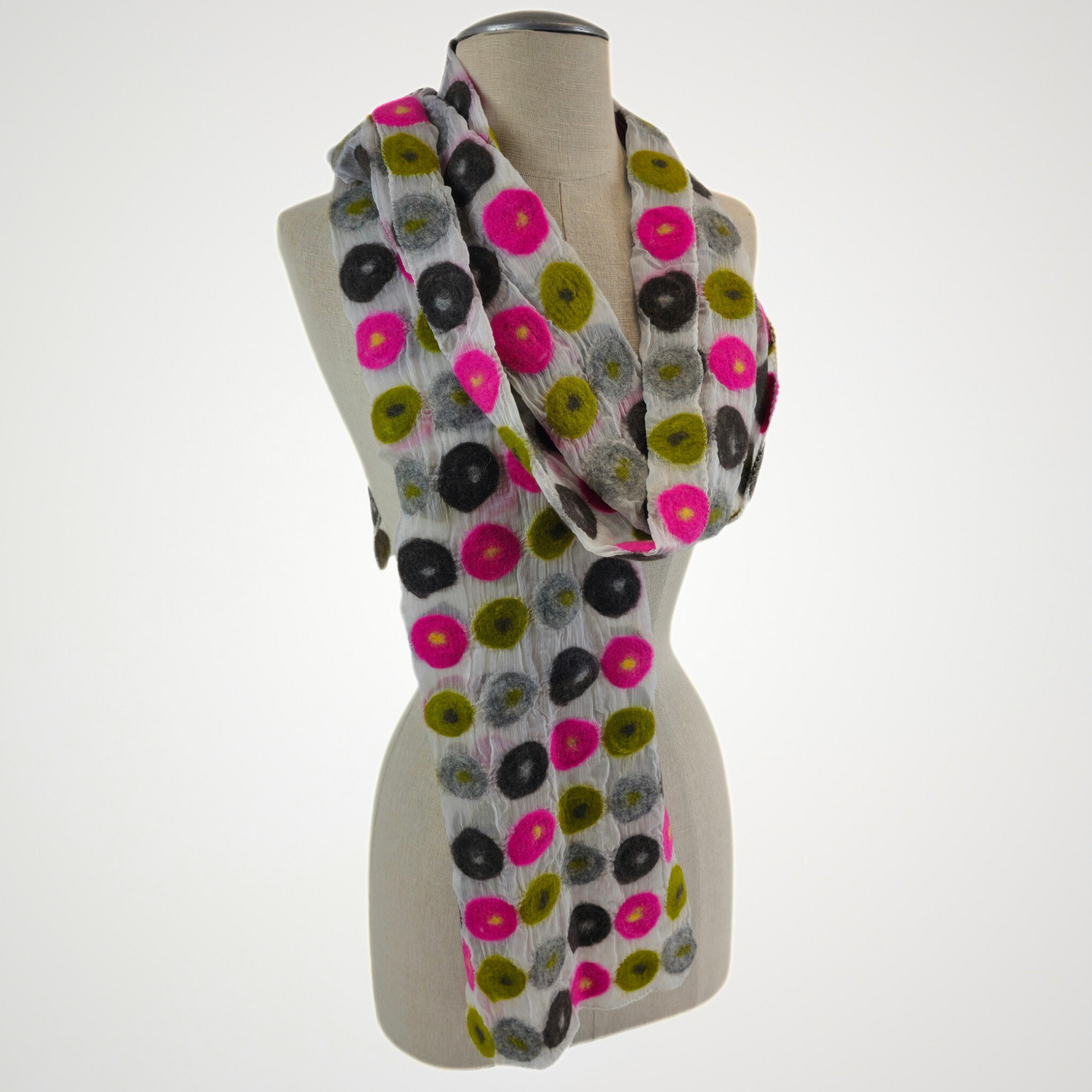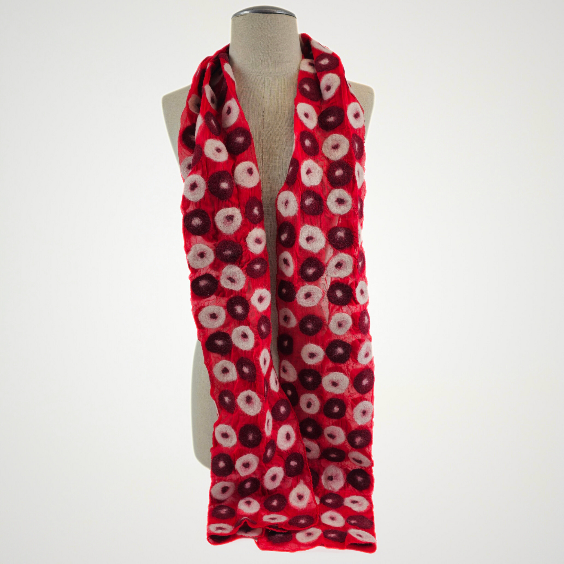 Indulge in the luxurious warmth and elegance of a handcrafted Polka Dotted Merino Wool Felted Scarf blending the finest Merino wool and silk. Each fiber intricately entwined, offering unparalleled softness and breathability. Hand-felting techniques bring out exquisite textures, ensuring a timeless accessory that embodies sophistication, comfort, and the artisanal heritage of Nepal.