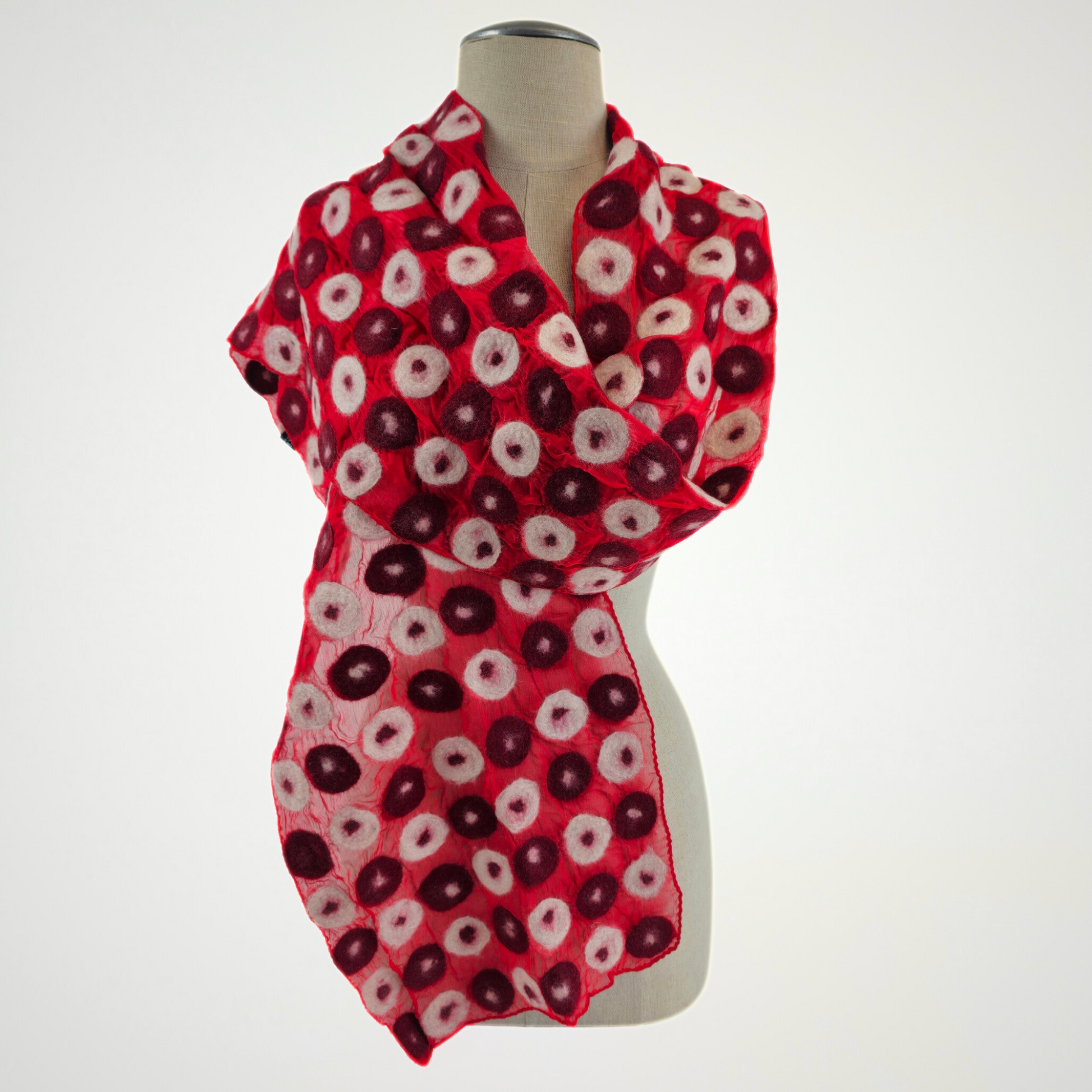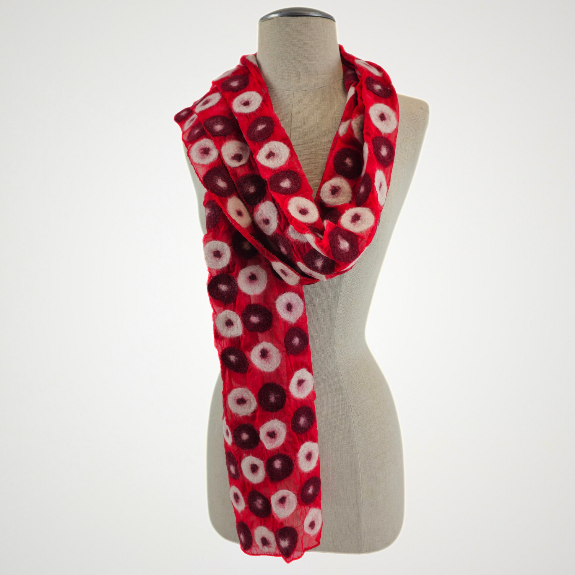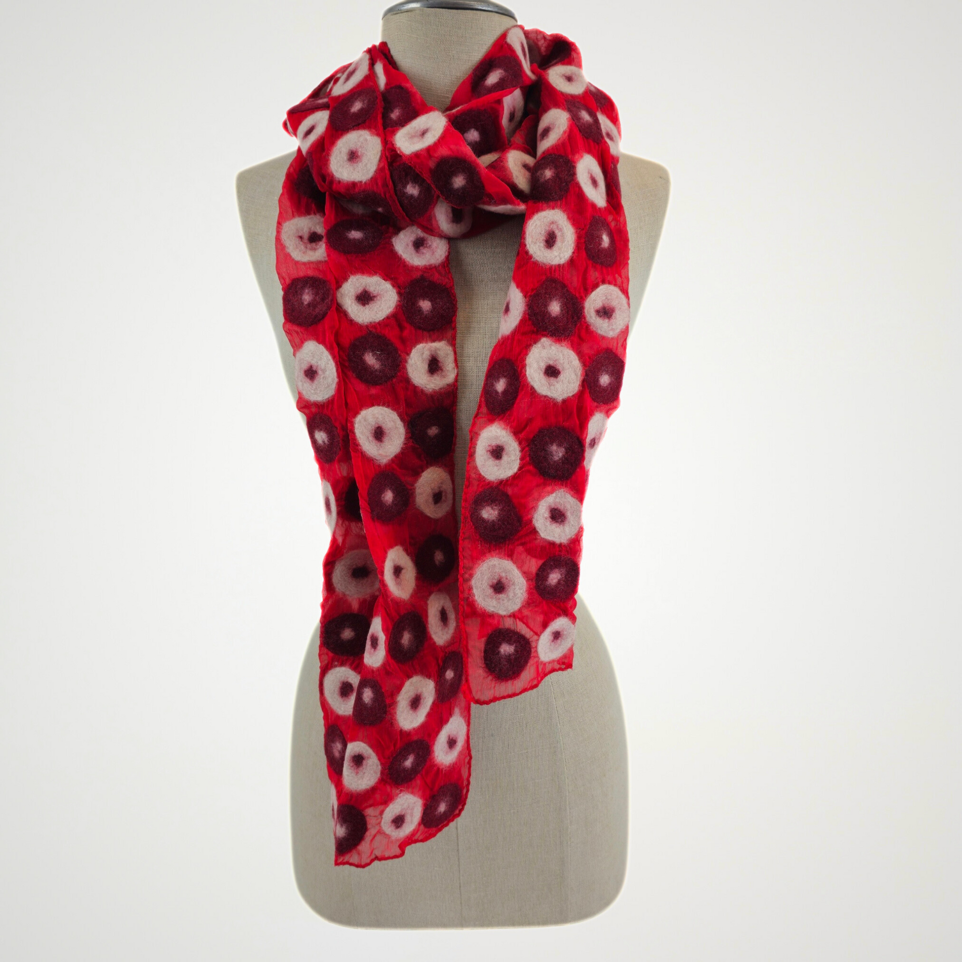 Indulge in the luxurious warmth and elegance of a handcrafted Polka Dotted Merino Wool Felted Scarf blending the finest Merino wool and silk. Each fiber intricately entwined, offering unparalleled softness and breathability. Hand-felting techniques bring out exquisite textures, ensuring a timeless accessory that embodies sophistication, comfort, and the artisanal heritage of Nepal.