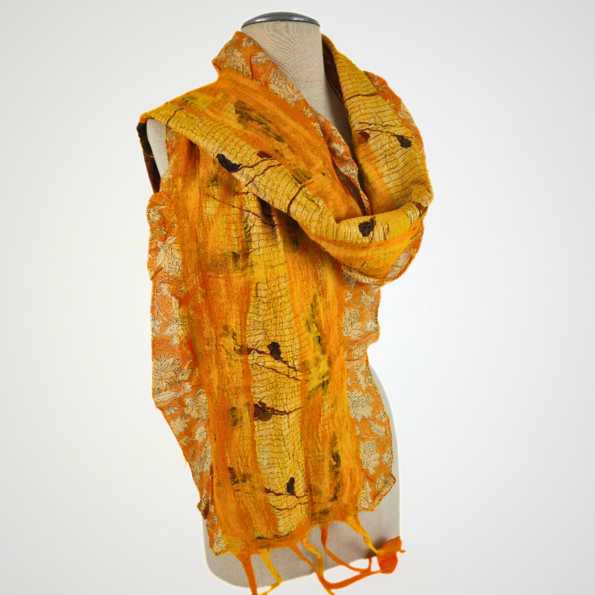 Saree Lace Golden Yellow Felted Scarf – A delicate fusion of vintage saree lace and soft felted wool, hand-crafted in rich green hues for a lightweight, elegant accessory that blends tradition with modern style. Also all the saree's color may very.
