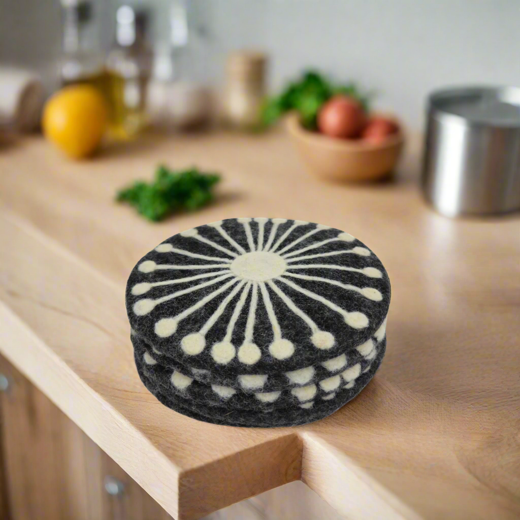 Discover our Handmade Wet Felt Trivet – a fusion of style, functionality, and artisanal craftsmanship! These distinctive trivets not only shield your surfaces from heat and scratches but also bring a burst of color and character to your kitchen and dining area. Each set features two vibrant, round trivets.